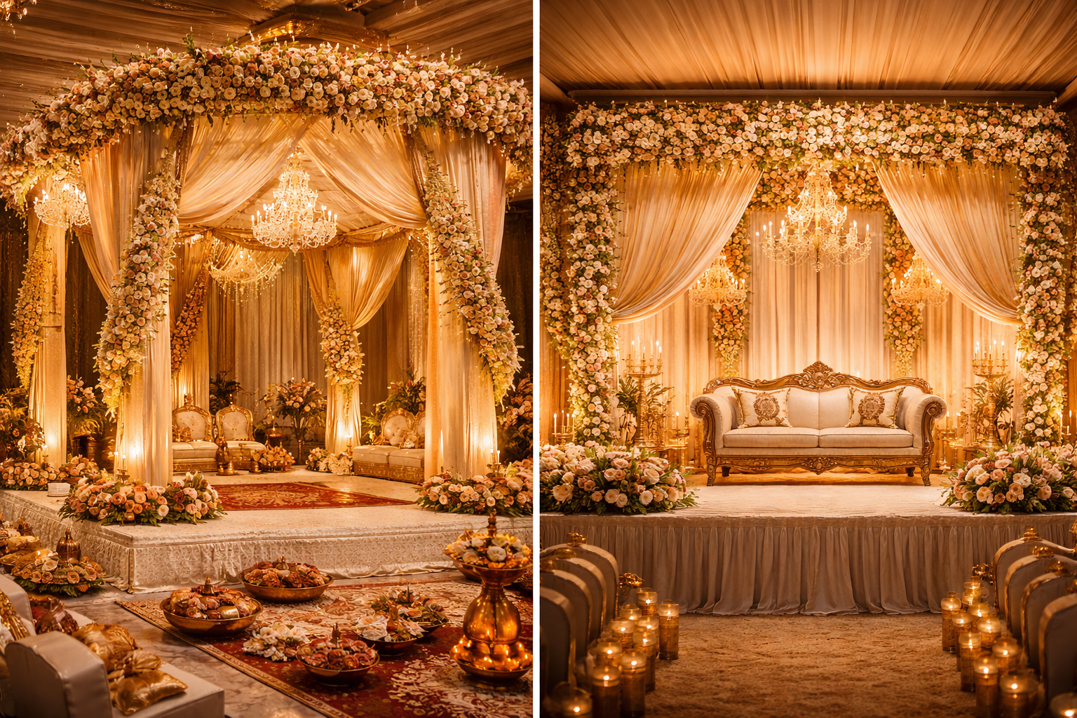We never copy-paste decor between mandap and stage. Mandaps are designed for rituals and comfort, stages are designed for visuals and guest experience. This balance saves money and avoids chaos on the wedding day.